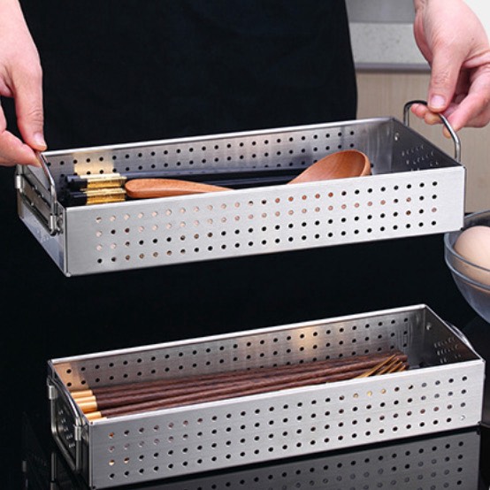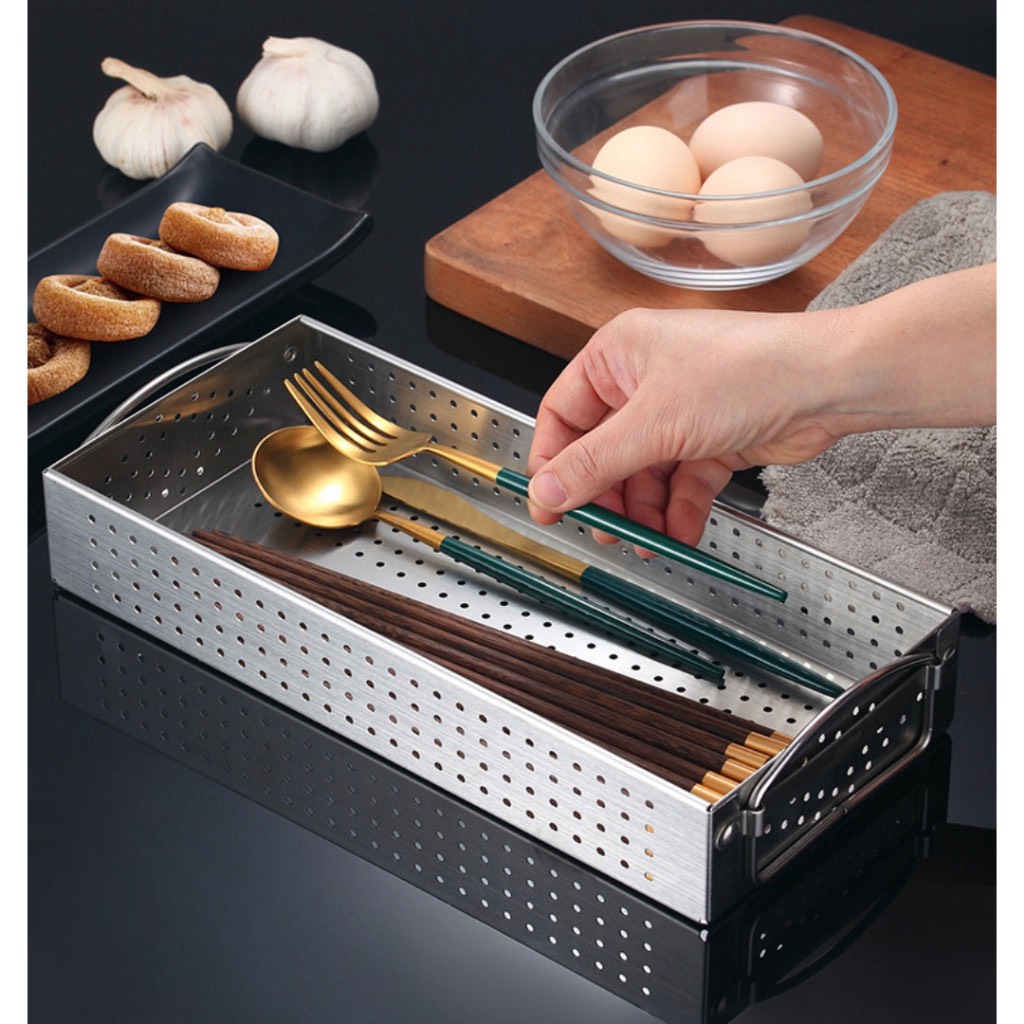 Khay đựng muỗng đũa inox 304 cao cấp có quai cầm và lổ thoát nước hàng đẹp sắc nét