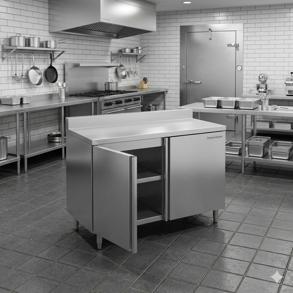 Kết luận: Quầy cửa mở inox là một khoản đầu tư thông minh cho bất kỳ hệ thống bếp chuyên nghiệp nào. Nó không chỉ là một chiếc bàn làm việc mà còn là giải pháp lưu trữ an toàn, sạch sẽ và thẩm mỹ.
