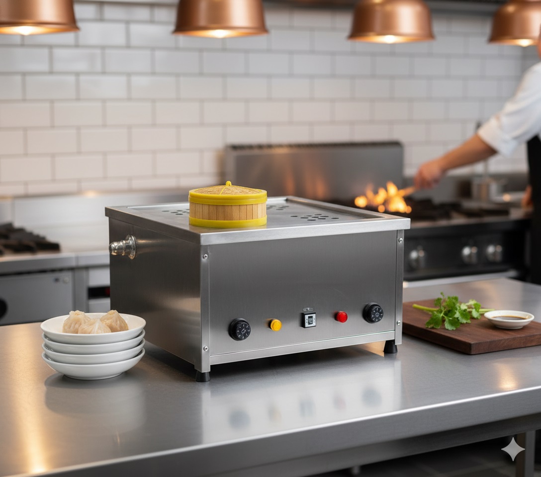 Bếp hấp dimsum 4 lỗ dùng điện của M Supply là sản phẩm tối ưu cho nhu cầu của nhà hàng chuyên món Trung Hoa, hấp bánh bao - dimsum - há cảo - các món hấp khác,...