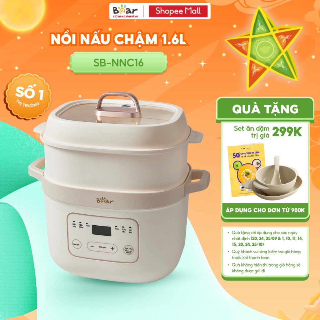 Nồi Nấu Chậm Bear 1,6L Đa Năng 6 Chế Độ Ninh Nấu Hầm Hấp Tiết Kiệm Thời Gian Giữ Trọn Chất Dinh Dưỡng - SB-NNC16